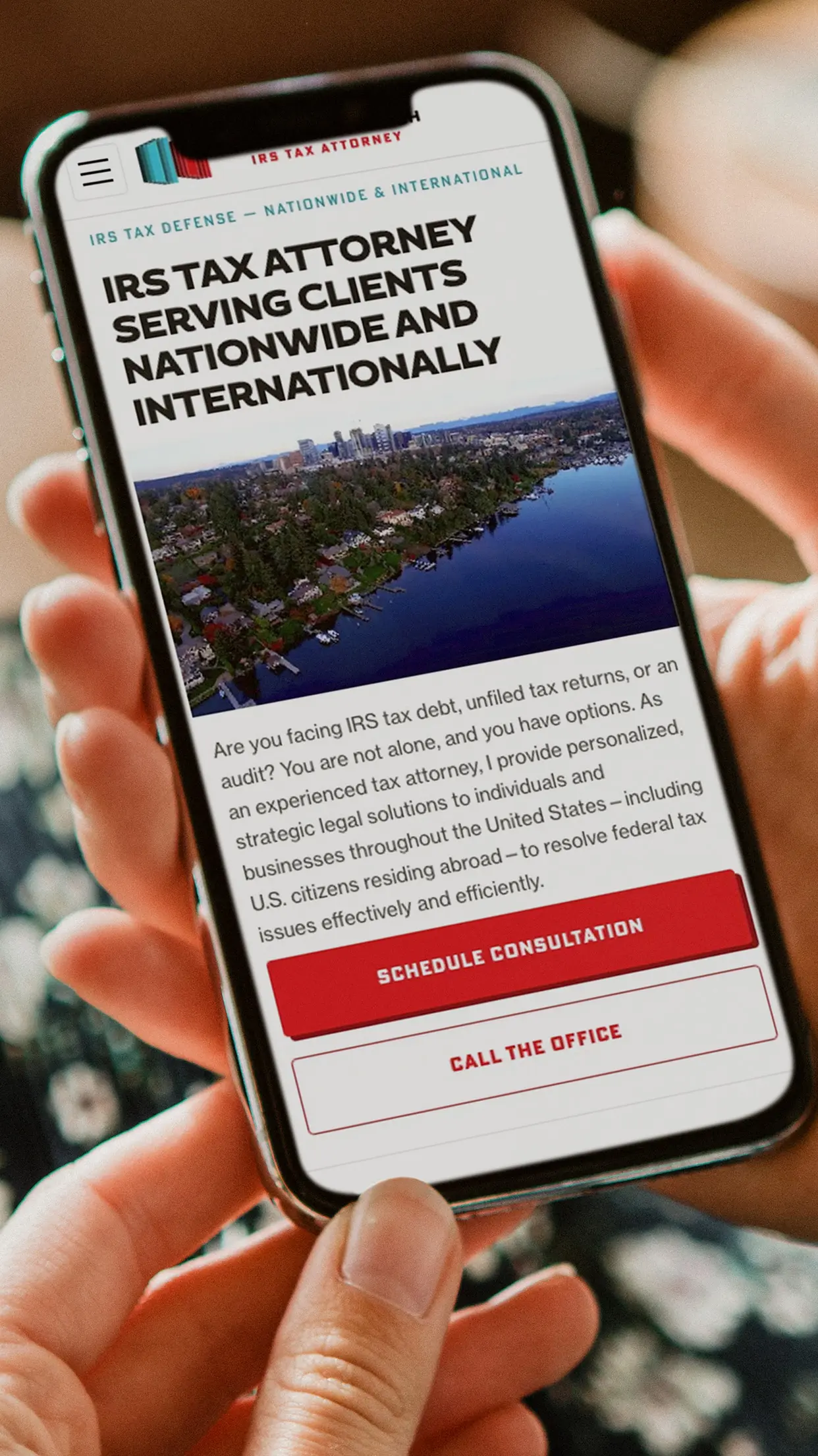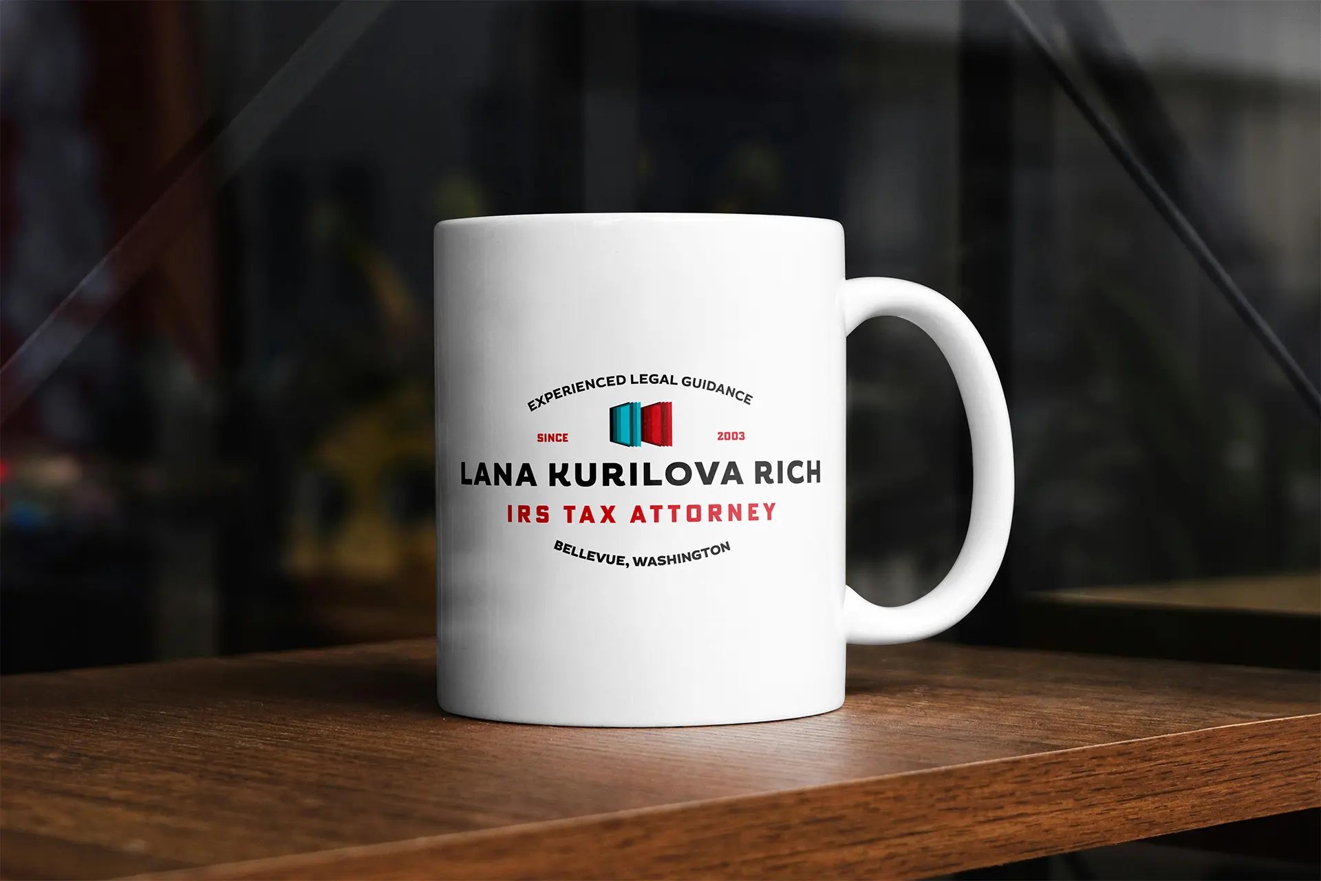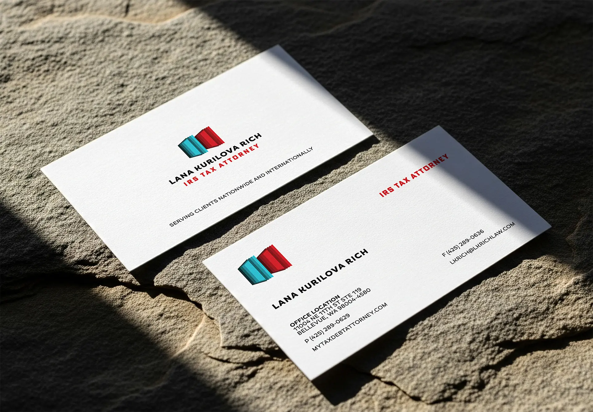 Lana Kurilova Rich is a tax law practice specializing in debt representation. The project centered on refreshing the firm's logo — originally a stacked law book mark — into a cleaner, minimal form featuring two standing books in the brand's signature red and teal. The simplified mark then informed the visual direction of a redesigned website built to reflect the professionalism expected in tax law.